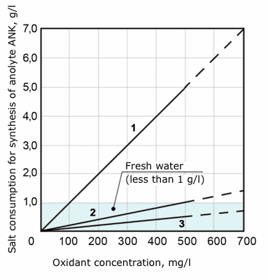 Ratio of salt used for the synthesis of 1 l of anolyte and oxidant concentration in anolyte ANK.